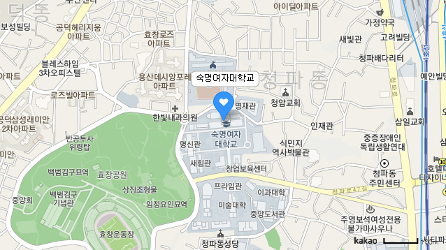 연락처 T. 02 2077 7874 (문화행정학과) / T. 02 710 9929 (사회복지학과) Email. cultureaa@sookmyung.ac.kr(문화행정학과) / p023399@sookmyung.ac.kr(사회복지학과) 위치 및 주소 숙명여자대학교 정책대학원 순헌관 701호 04310 서울특별시 용산구 청파로47길 100(청파동2가) 찾아오시는 길 로드뷰 길찾기 지도 크게 보기 숙명여자대학교 정책대학원 순헌관 701호